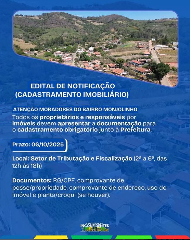 Ficam notificados todos os proprietários, possuidores ou responsáveis por imóveis situados no Bairro Monjolinho a apresentarem a documentação necessária para o cadastramento obrigatório dos imóveis junto ao Setor de Cadastro Imobiliário da Prefeitura.