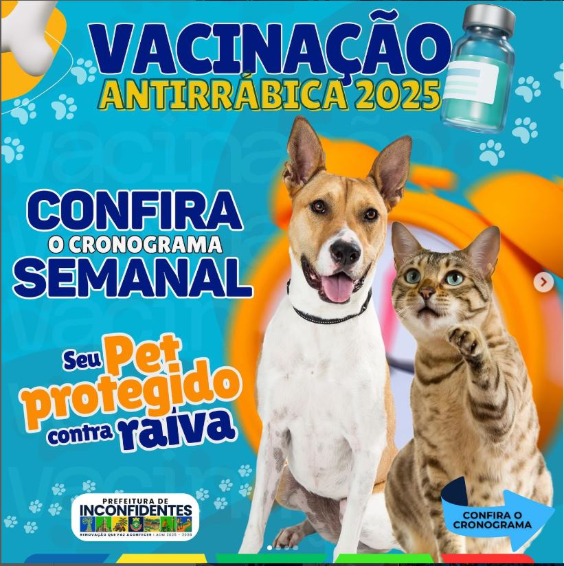 A Prefeitura Municipal de Inconfidentes, por meio da Secretaria de Saúde e da Vigilância em Saúde, segue com a vacinação gratuita e obrigatória contra a raiva em cães e gatos a partir de 3 meses de idade.