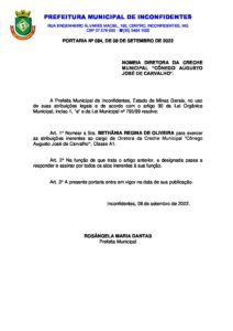 PORTARIA 084/2022 – NOMEIA DIRETORA DA CRECHE MUNICIPAL “CÔNEGO AUGUSTO JOSÉ DE CARVALHO”